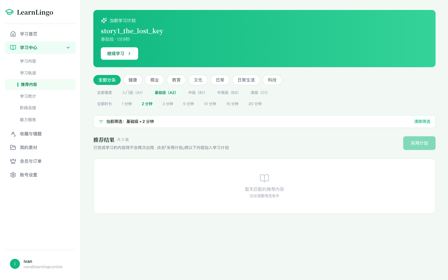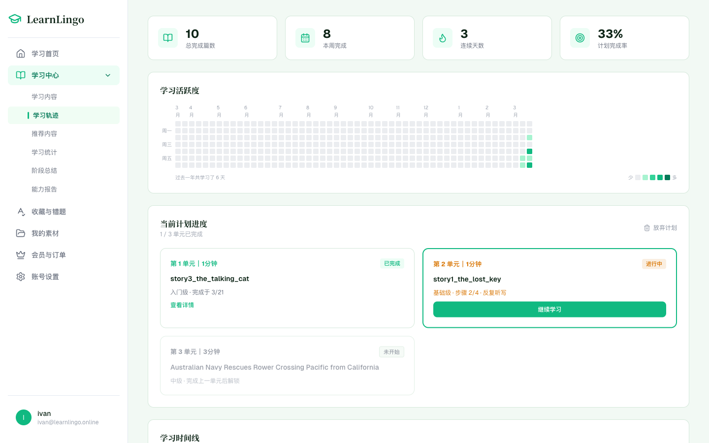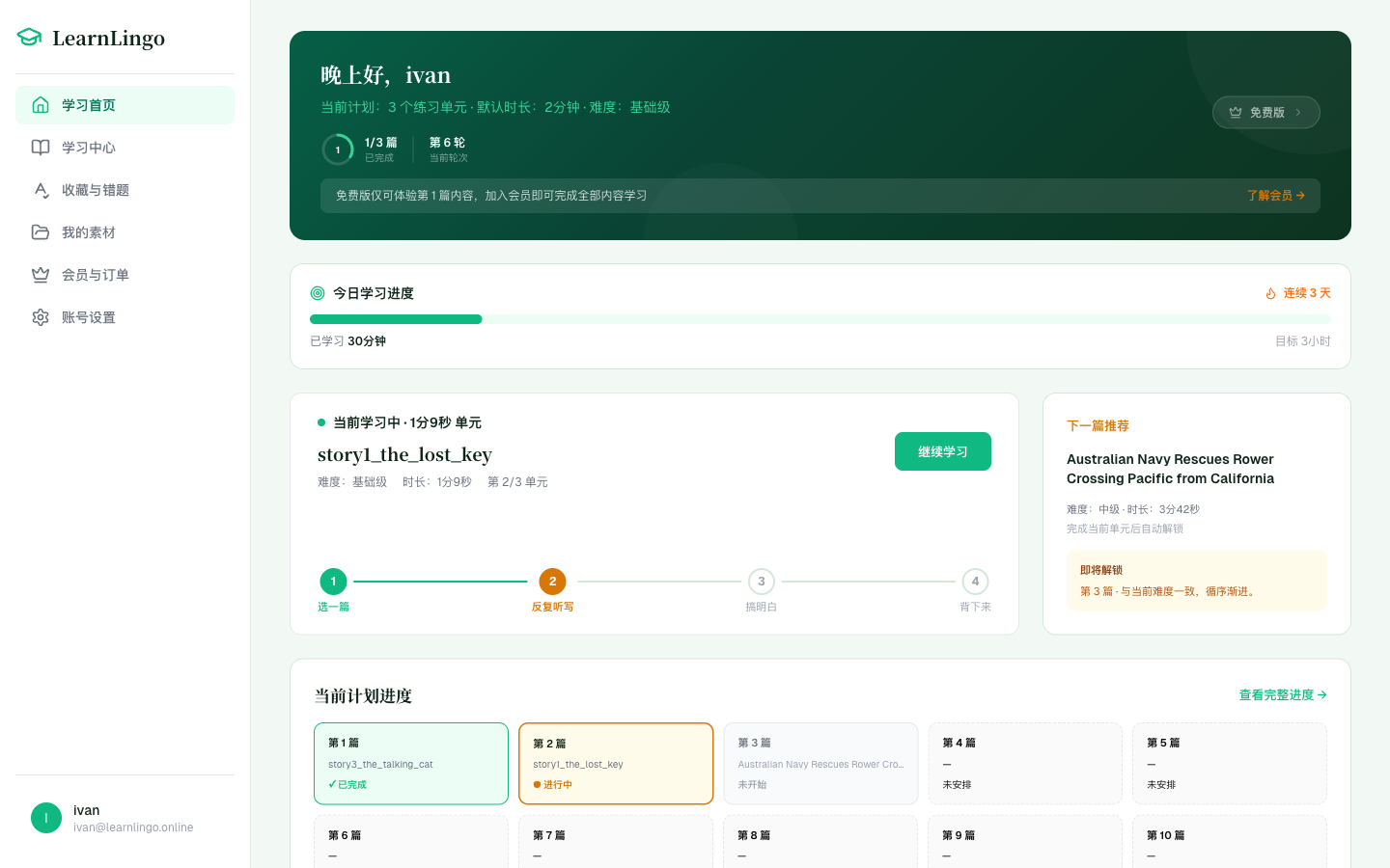 LearnLingo 把学习组织成一轮一轮的计划: