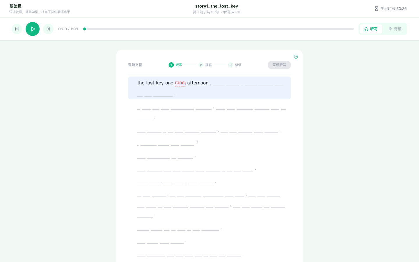空格键播放暂停,空格/Tab 跳下一个词,Alt/Cmd 跳回当前播放的句子。第一次进听写页面会有引导教你。