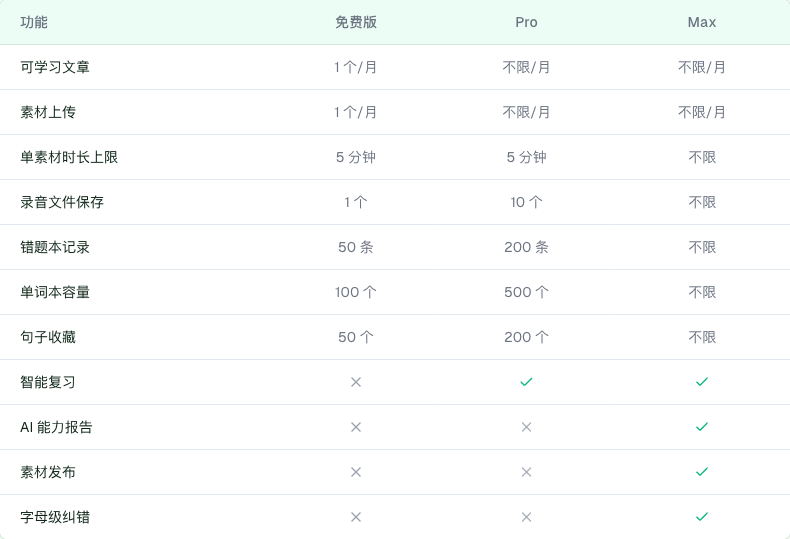 | 背诵录音保存 | 1 个 | 10 个 | 不限 |