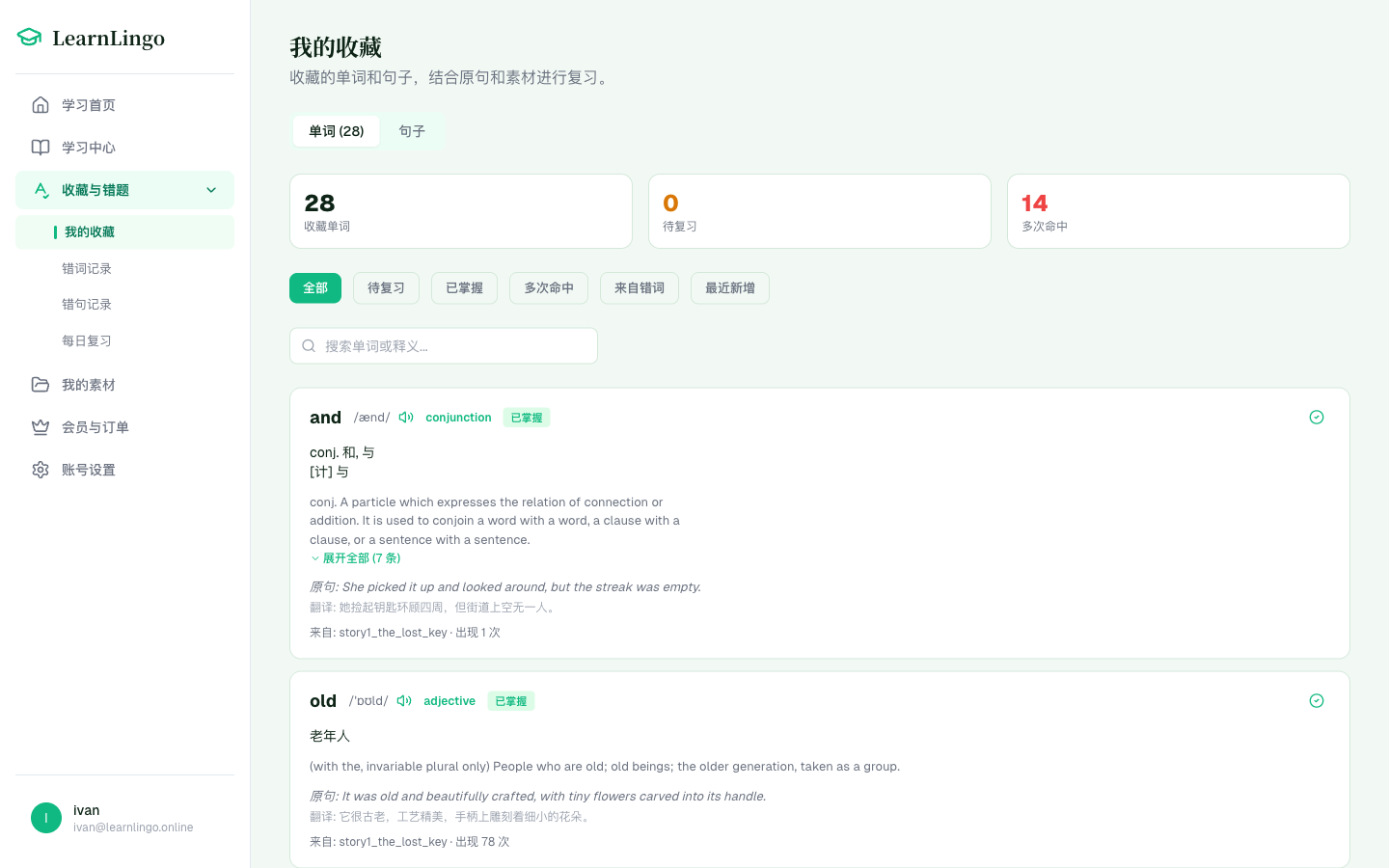 - 掌握状态:待复习 / 已掌握 / 多次命中(老朋友了)