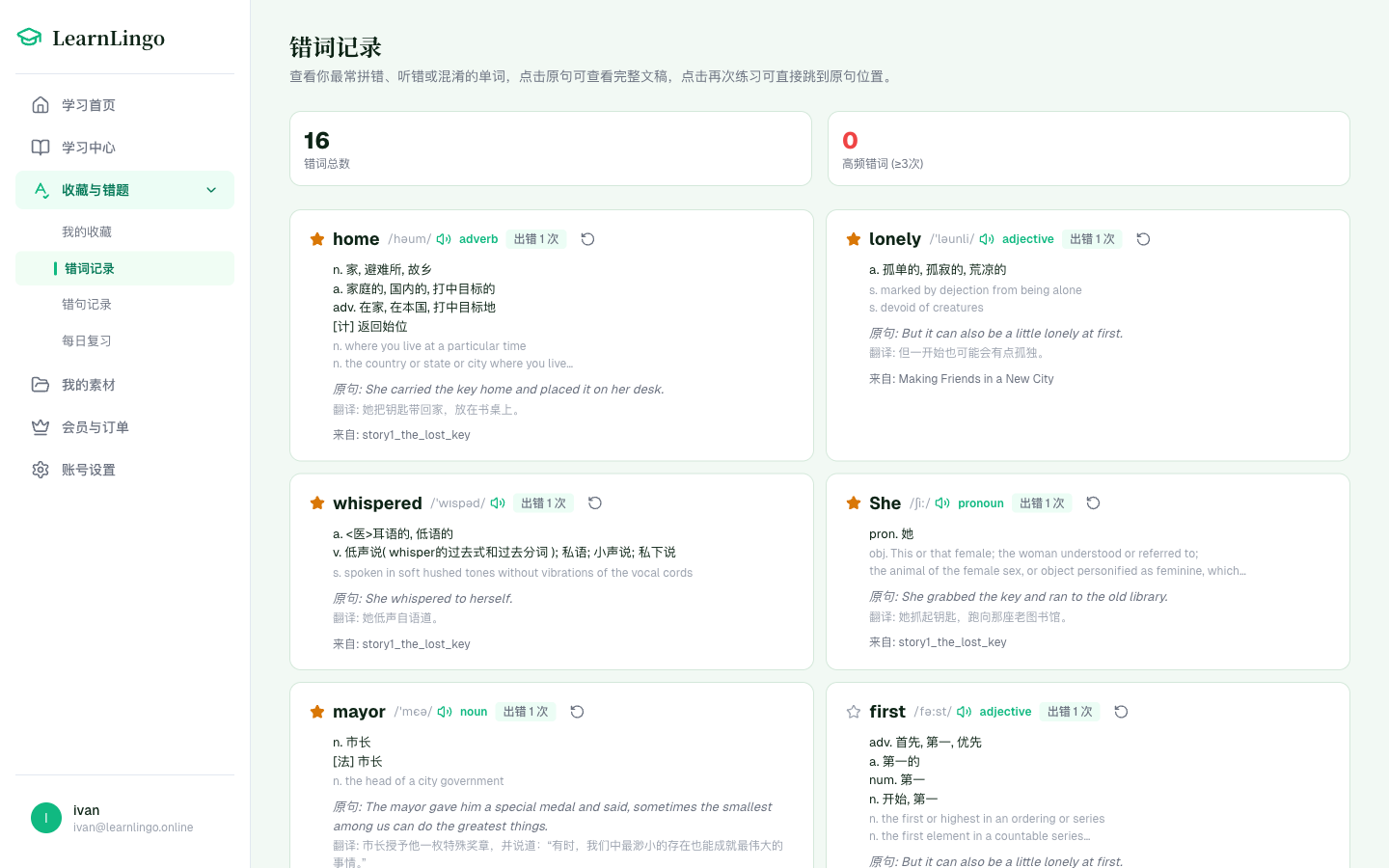 - 每个错词带音标、词性、中英释义,还有你当时写错的那句原文